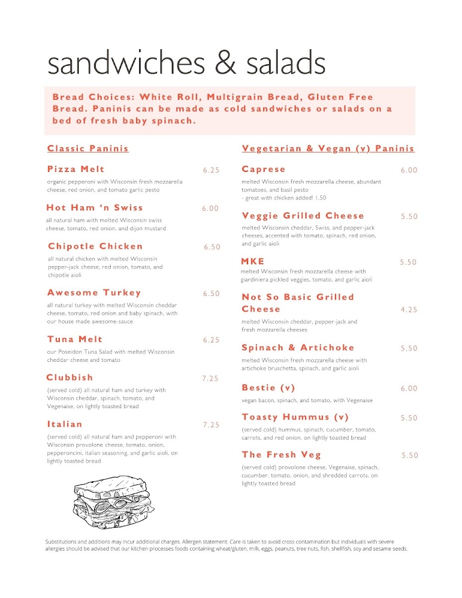 Nestled in Janesville, WI, Basics Co-op Cafe offers a delightful menu that caters to health-conscious diners. Their breakfast paninis are highlights, featuring options like the Egg & Cheese Panini for just $4.60 or the heartier Egg, Bacon & Cheese Panini at $6.90. Each choice is crafted with organic American cheese and high-quality meats, ensuring a satisfying start to your day.